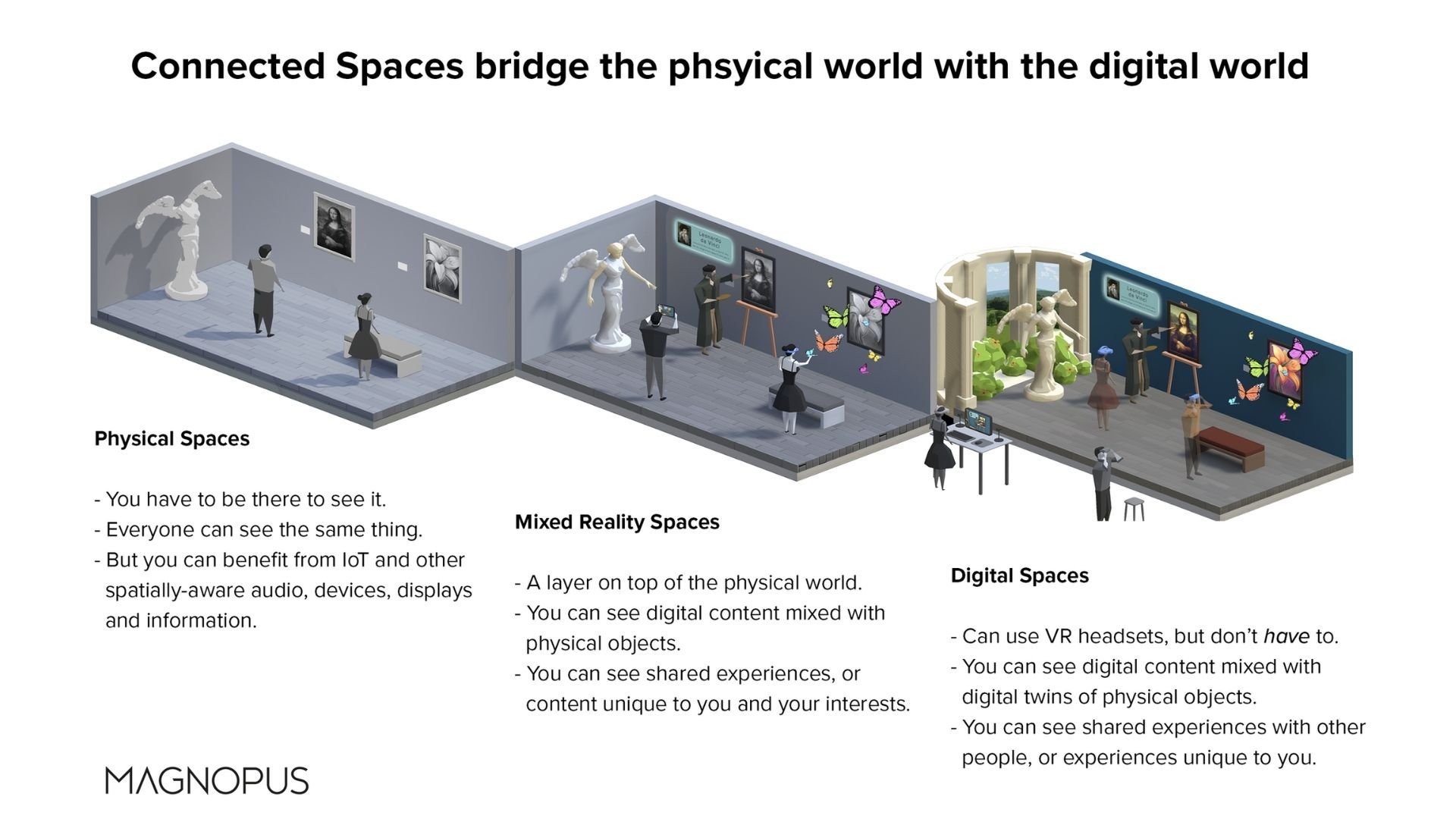Right now we live in two disconnected worlds: a 3D physical world (concerts, museums, offices) and a flat 2D digital one, (websites, apps, videos). Living in two different worlds like this is unnatural to us – we’re spatial creatures – we understand information and enjoy experiences much better when they interact with us and our environment, rather than being flat.