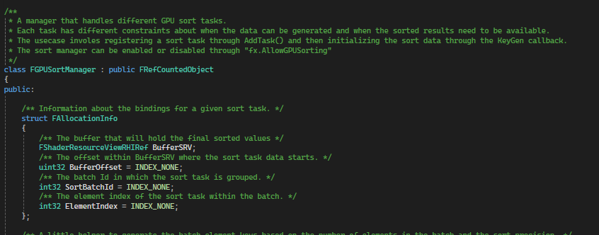 FGPUSortManager::AddTask, providing the sort options you need via the sort flags (like whether to run the sort afterPreRender, or after drawing all opaques), and the number of items to sort. That’ll arrange the sort task for you. - And finally, consume the results. Depending on where in the frame you asked for the sort to happen in 2, bind to the