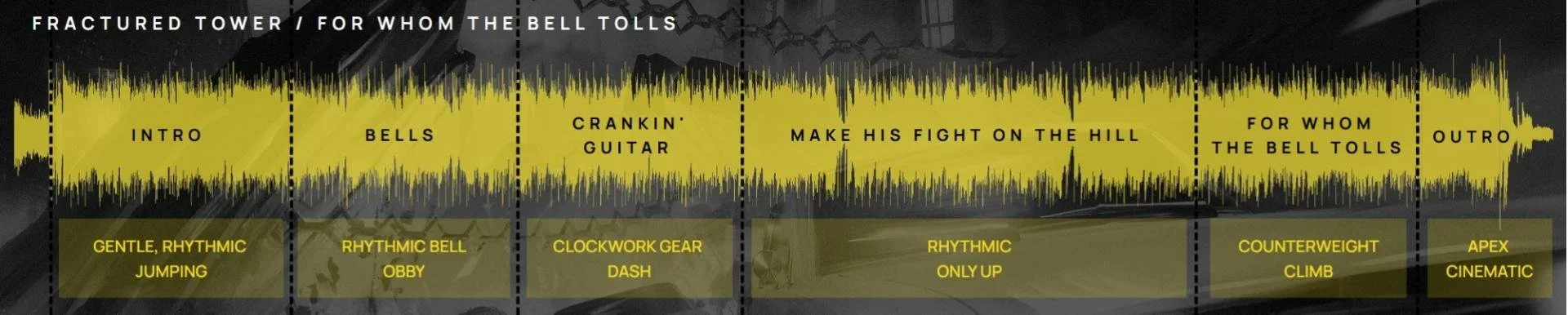 We made sure that the first time a player encountered a mechanic, it was the easiest possible variant, and the section contained that singular mechanic only, reducing the cognitive load and creating a gentle onboarding for each element. This was most evident in “For Whom The Bell Tolls” where we introduced players to rhythmic steps, swinging bells, and rotating cogs each in their own, isolated sections, before bringing all those elements together for the most intense part of the song.