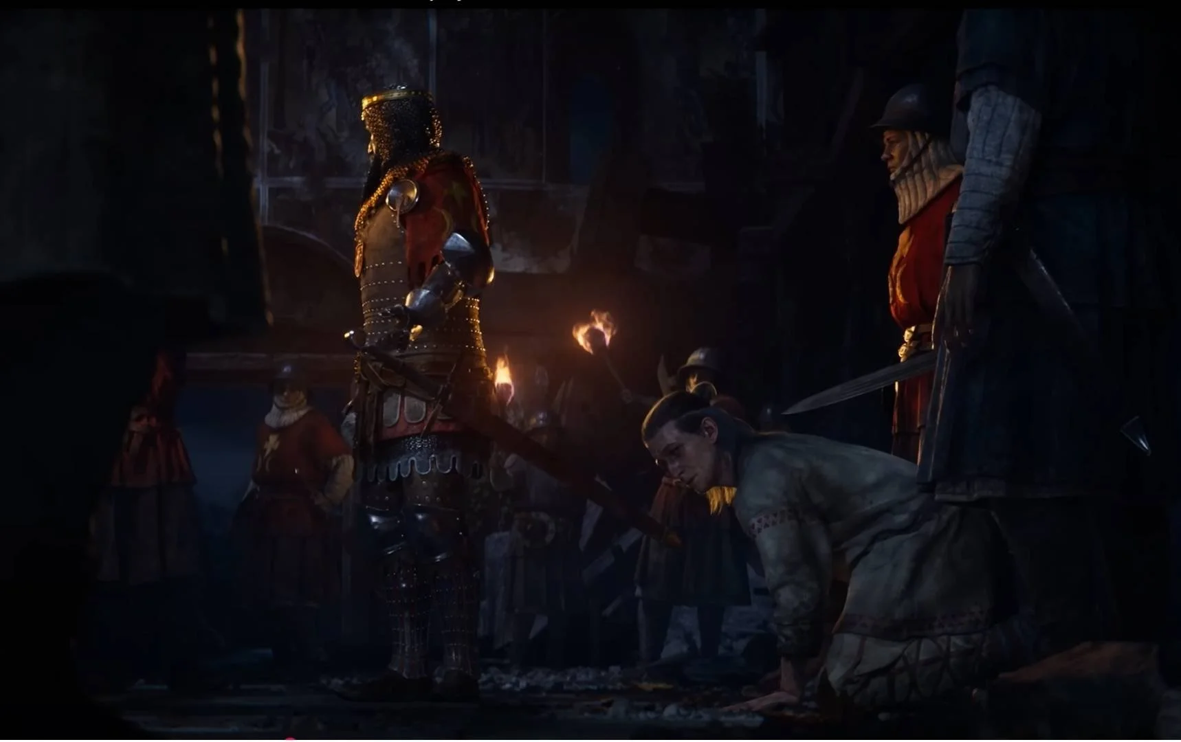 An object with a sharp point, like the sword in this scene, is a strong tool. It functions similarly to a line by directing the viewer's gaze, but the sharp tip introduces an element of tension and focus that demands attention.