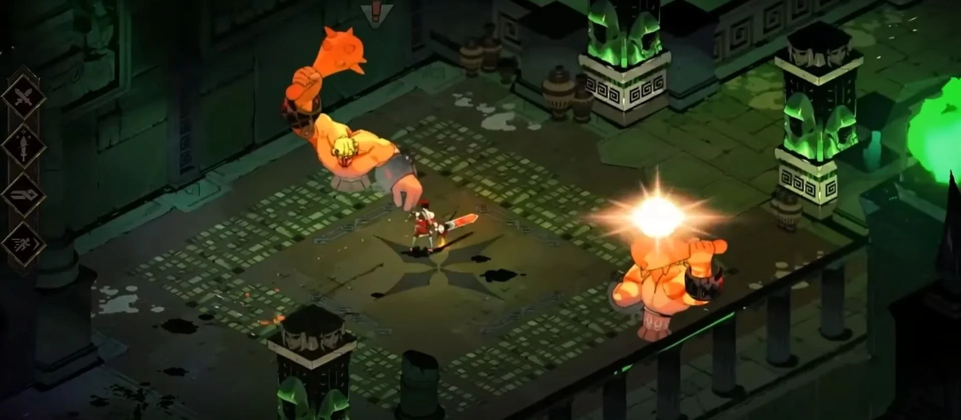 However, the monsters are also bright, saturated, and a complementary color. On top of that, they move, so they'll draw focus even more than the pillars. The player's first read of this area will therefore be the monsters, the second the pillars, and thirdly, everything else. Paying attention to these visual hierarchies makes for a better player experience, as it gives you control over their focus.