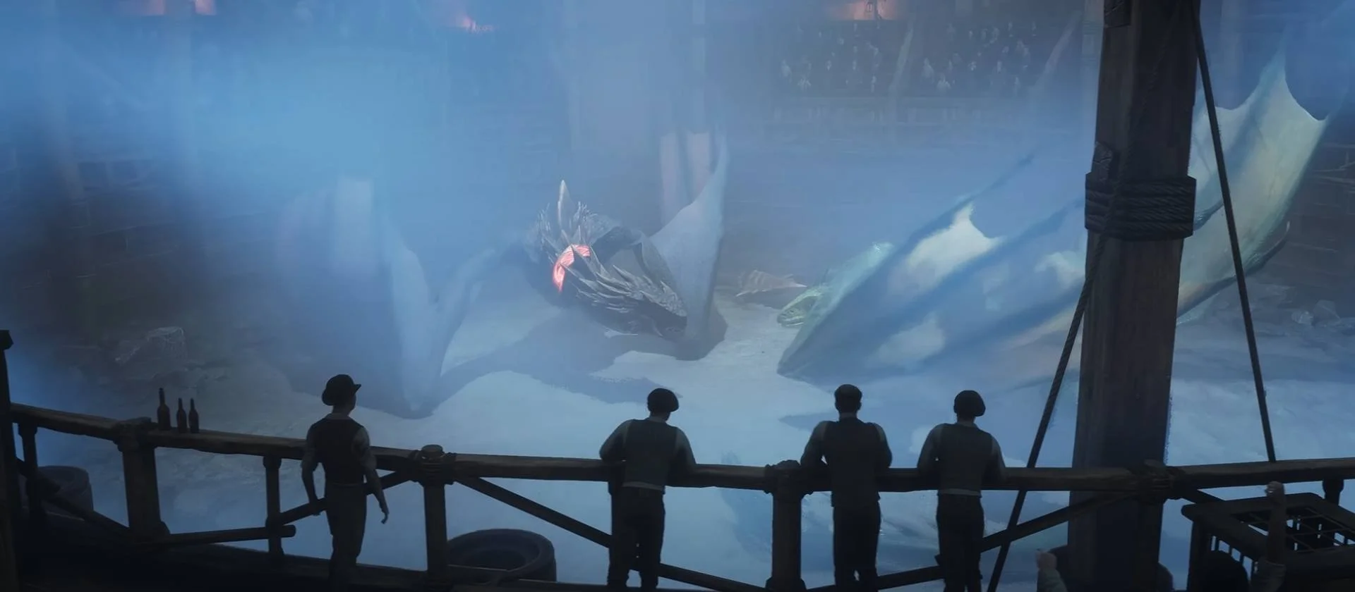 Meanwhile, we hear the sounds of water and a crackling fire. These textures bring us into the world, give us a sense of what it would be like to be there in the room. It’s a subtle way of worldbuilding that doesn’t require any words. Texture can be just visual, but it’s even better when it’s accompanied by excellent sound design.