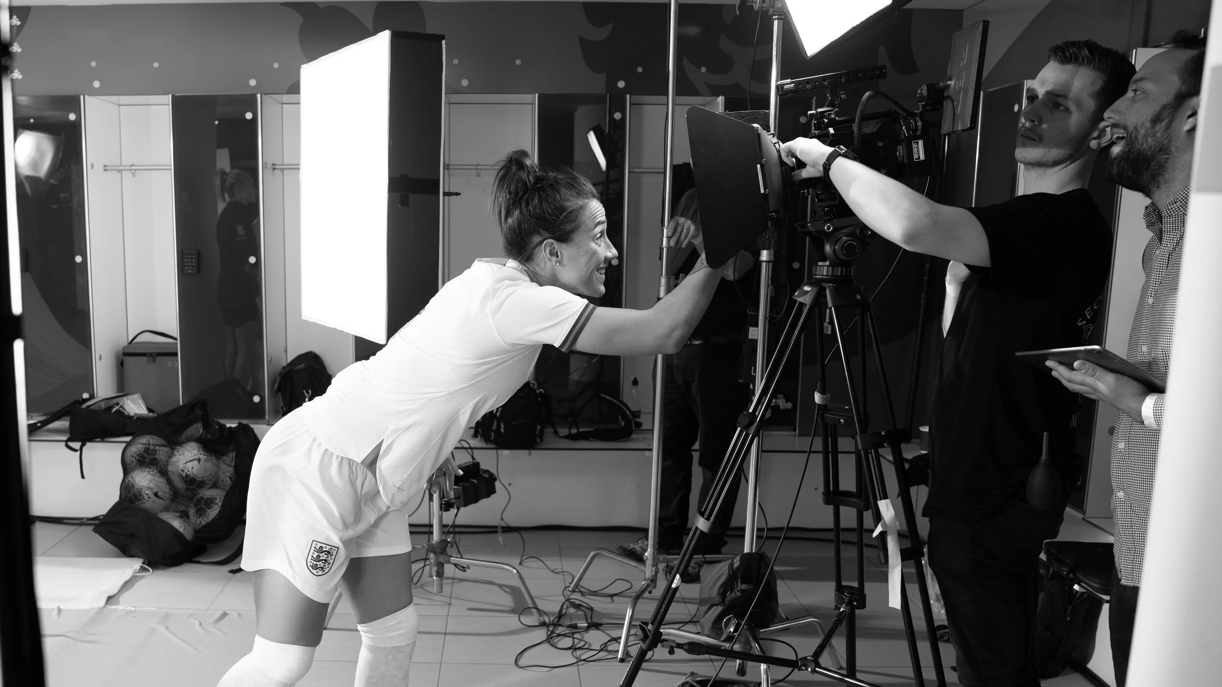 During a green screen shoot, a number of different videos were created to engage people passing by the screens. These include the Lionesses playing keepy-uppy, Gareth Southgate planning his match strategy, and the talent waving the user over. This footage was integrated into Unreal Engine 4 to play on the two giant interactive touch screens.